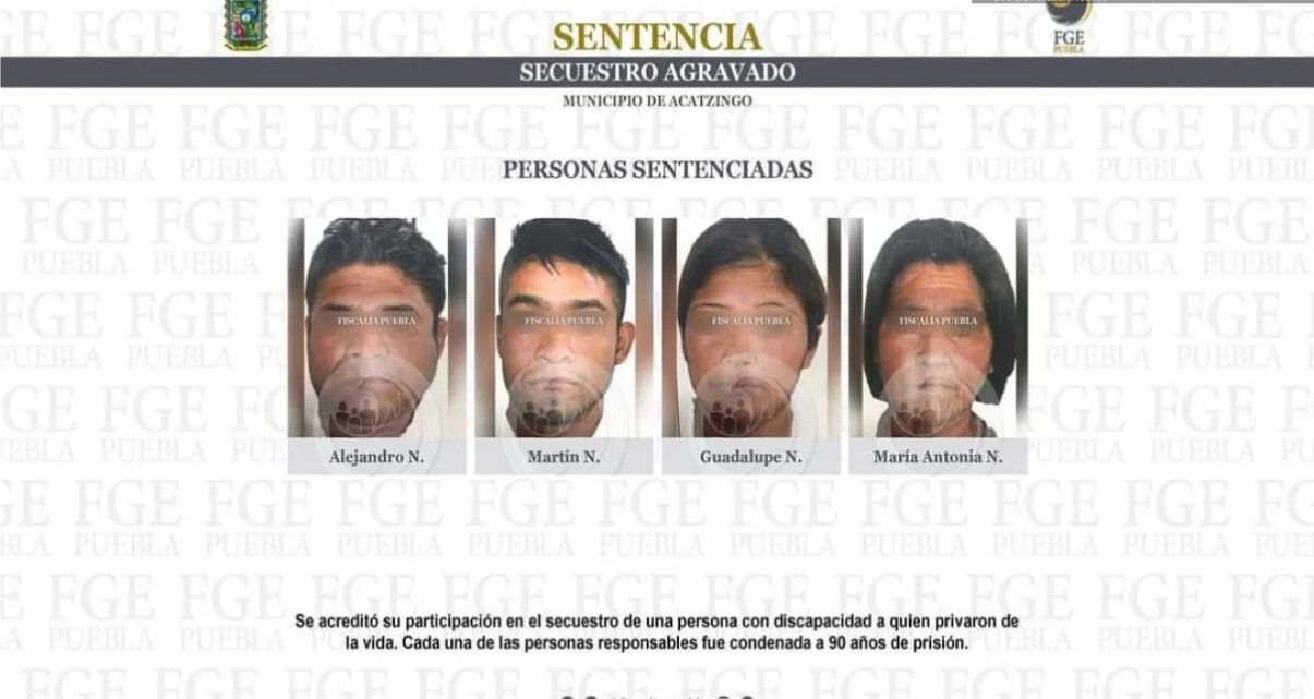Acatzingo de Hidalgo, Pue.- L a Fiscalía General del Estado (FGE) de Puebla a través del área de investigación de delitos de alto impacto, obtuvo la sentencia de 90 años de prisión en contra de Martin N., Guadalupe N., de María Antonia N. y de Alejandro N. por el secuestro del cuñado de este último quien tenía una discapacidad, además de que son investigados por el homicidio de su víctima, en donde su cuerpo fue hallada sin vida en el municipio de Acatzingo.