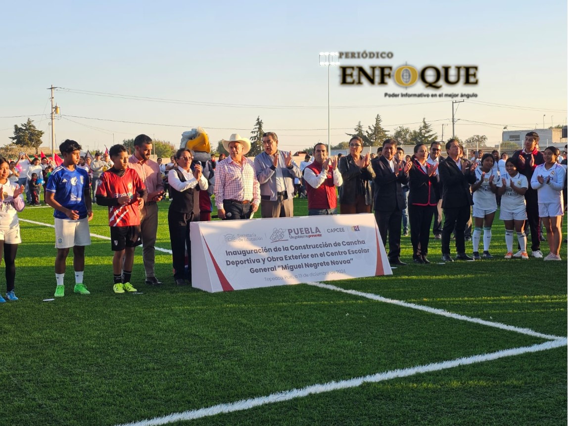 Agregó que las obras de dicha institución, corresponde a una cancha de fútbol que contiene pasto sintético, luminarias, gradas, y porterías; además del domo inaugurado en el área de bachillerato, y agregó que anteriormente ya se habían entregado cuatro aulas; así como una cancha de sus múltiples que consta de dos canchas de básquet, una de voleibol y una de fútbol rápido; y dos techados escolares (uno en prescolar y otro en primaria).
