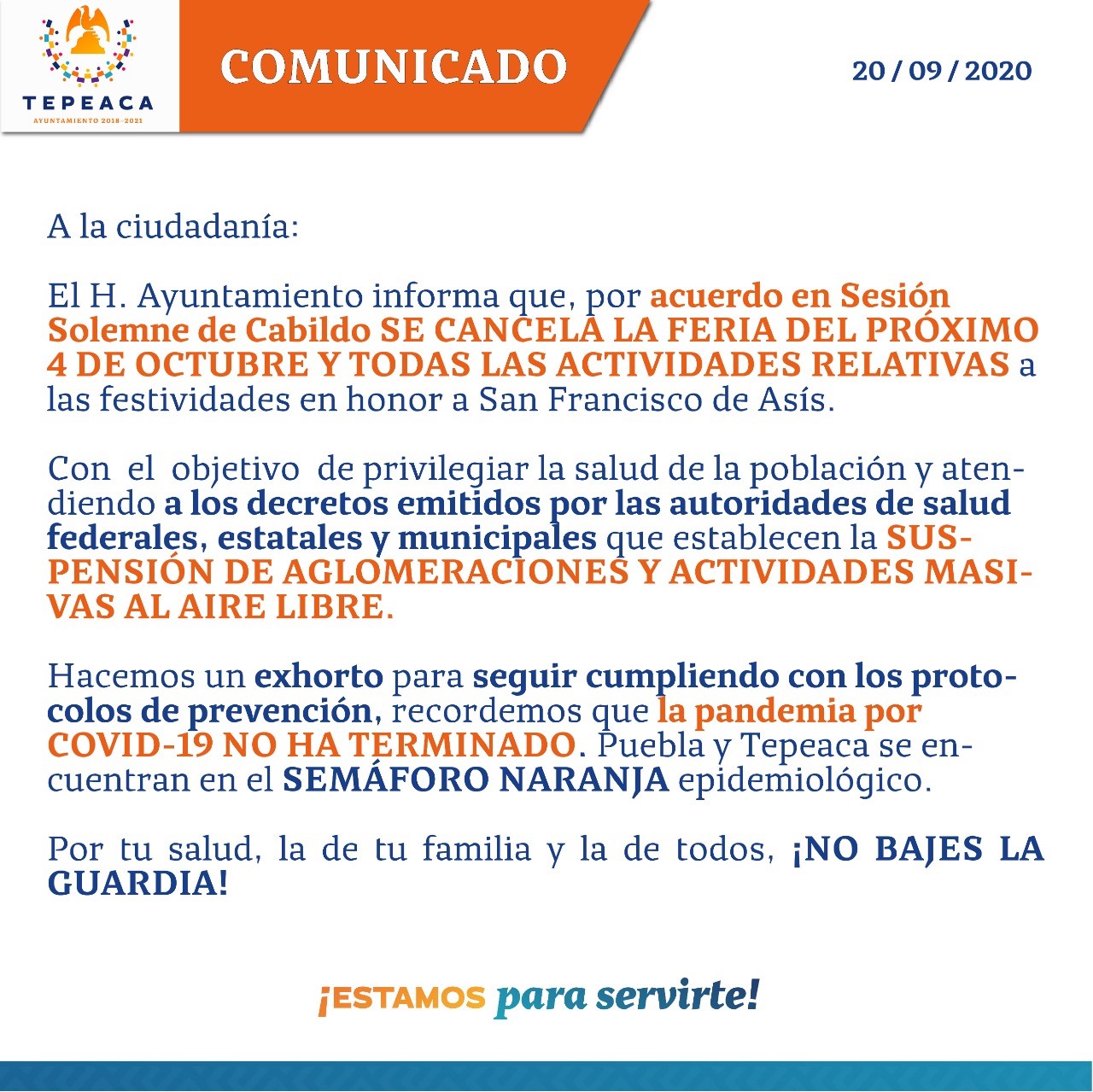 Tepeaca, Pue. El ayuntamiento de Tepeaca dio a conocer la cancelación de la feria del próximo 4 de octubre, en honor a San Francisco de Asís, con el objetivo de privilegiar la salud de la población.