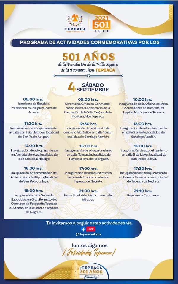 Los festejos darán inició con una ceremonia cívica, en conmemoración de los 501 Aniversario de la Fundación de la Villa Segura de la Frontero, hoy Tepeaca de Negrete.
