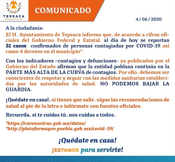 Tepeaca, Pue. De acuerdo con cifras oficiales del Gobierno Federal, el Ayuntamiento de Tepeaca informó que el municipio reporta ya 31 casos confirmados de personas por Covid-19 y 4 decesos.