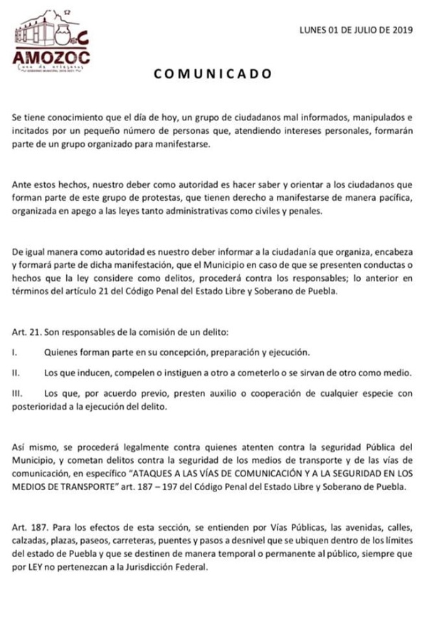 “Como autoridad es nuestro deber informar a la ciudadanía que organiza, encabeza y forma parte en dicha manifestación, que en el municipio en caso de que presenten conductas o hechos que la ley considere como delitos, procederá contra los responsables; lo anterior en términos del artículo 21 del Código Penal del Estado Libre y Soberano de Puebla”, detalla el comunicado.