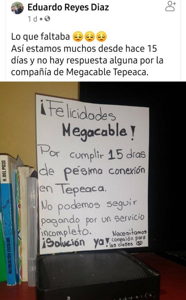 A través de redes sociales se hizo viral un anuncio, donde un usuario expresa su queja “Felicidades Megacable, por cumplir 15 días de pésima conexión en Tepeaca, no podemos seguir pagado un servicio incompleto, ¡solución ya!”