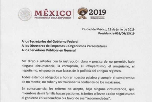 AMLO ordena en memorándum cerrar puertas del gobierno a sus familiares