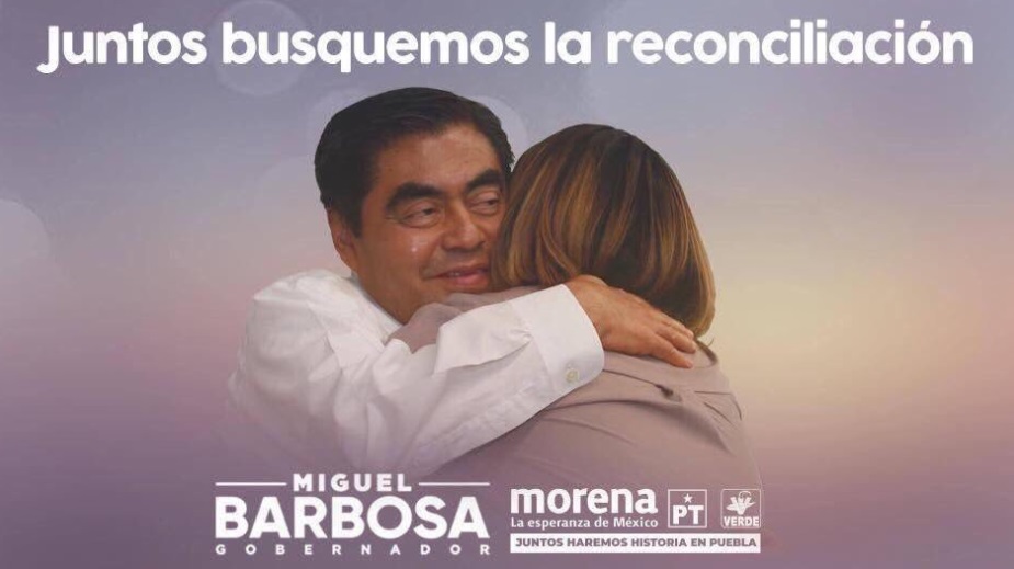 Recordemos que la propaganda fuertemente criticada en redes sociales, Miguel Barbosa abraza a una mujer -con características similares a Martha Erika Alonso- y tiene un fondo difuminado aludiendo a nubes y al cielo.