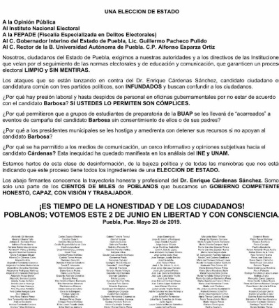 El desplegado publicado en el periódico Reforma (medio nacional), está dirigido al Instituto Nacional Electoral, a la Fiscalía Especializada en Delitos Electorales (FEPADE) y al rector de la BUAP, Alfonso Esparza, a este último se le señala de "acarrear" a estudiantes a los mítines de Babosa.