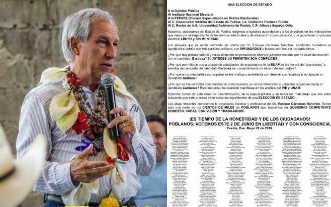 Los firmantes aseguran estar hartos de la desinformación, de la bajeza política y de todas las maniobras que les está indicando que este proceso electoral en Puebla tiene todos los ingredientes de una elección de Estado.