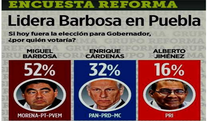 De acuerdo a la publicación de la encuesta en el periódico nacional Reforma, la mayoría de los poblanos entrevistados votarían por Miguel Barbosa con un 52 por ciento, mientras con 32 por ciento hacia Enrique Cárdenas y un 16 por ciento por Alberto Jiménez, del PRI.