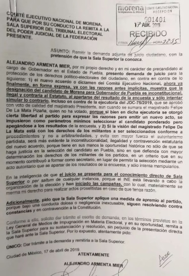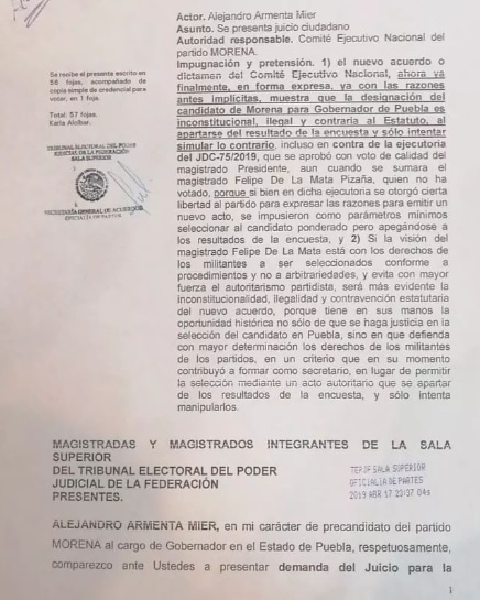 El documento dirigido al CEN de Morena para ser remitido a la Sala del TEPJF cita lo siguiente: “Ahora va finalmente, en forma expresa, ya con las razones antes implícitas, muestra que la designación del candidato de Morena para Gobernador de Puebla es Inconstitucional, ilegal y contraria al Estatuto, al apartarse del resultado de la encuesta y sólo intentar simular lo contrario, incluso en contra de la ejecutoria del JDC-75/2019, que se aprobó con voto de calidad del magistrado Presidente”.