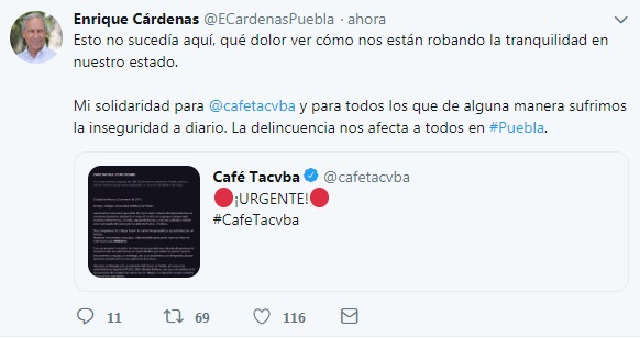 «Esto no sucedía aquí, qué dolor ver cómo nos están robando la tranquilidad en nuestro estado. Mi solidaridad para @cafetacvba y para todos los que de alguna manera sufrimos la inseguridad a diario. La delincuencia nos afecta a todos en #Puebla», escribió.