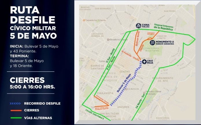 A través de redes sociales, se informó que en el evento que inicia en el bulevar 5 de Mayo-43 poniente y termina en el bulevar 5 de Mayo y 18 Oriente, las labores de gestión vial se realzarán para mayor seguridad de asistentes y contingentes que participarán en este magno evento.