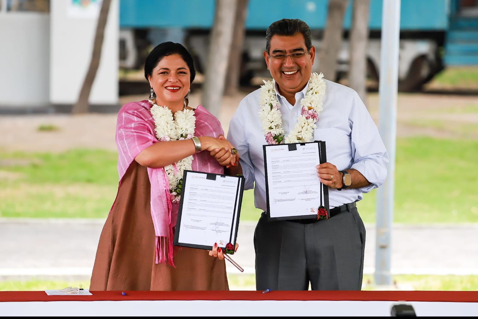 En el acto, la secretaria de Cultura federal, Alejandra Frausto Guerrero, comentó que con la firma de convenio: “Venimos a refrendar el compromiso por seguir profundizando los procesos culturales que están vivos en Puebla y que tienen oportunidad de crecer y de consolidarse”.