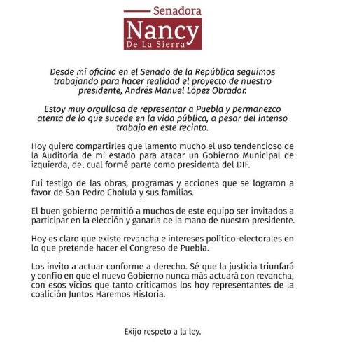 “Hoy quiero compartirles que lamento mucho el uso tendencioso de la Auditoria de mi esposo para atacar un gobierno municipal de izquierda (PT), del cual formé parte como presidenta del DIF.