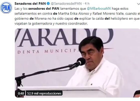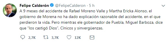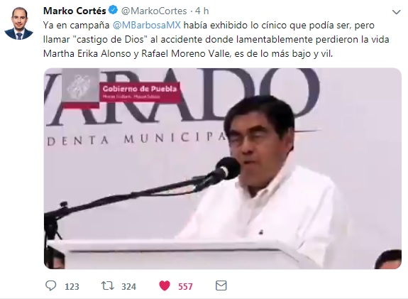 “Yo gané, me la robaron, pero los castigó dios”, dijo el Gobernador de #Puebla, Miguel Barbosa @MBarbosaMX, sobre la muerte de Martha Erika Alonso y Rafael Moreno Valle. Increíble el descuido, el desprecio por las palabras y por el dolor ajeno pic.twitter.com/372wOX6P1g