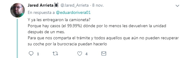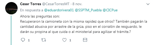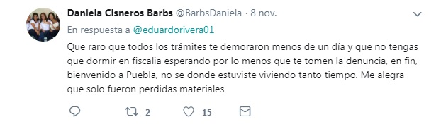“Hola Eduardo, lamentamos muchísimo la situación. Podemos apoyarte con la denuncia a través de @CCSJPuebla o si gustas vía MD puedes brindarnos tus datos para comunicarnos contigo y brindarles asesoría y canalizar la información de inmediato”.