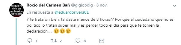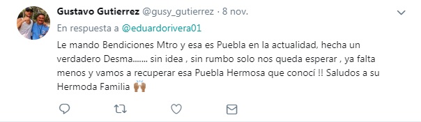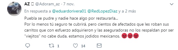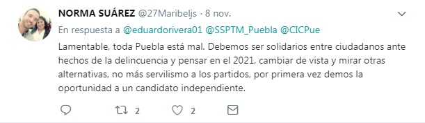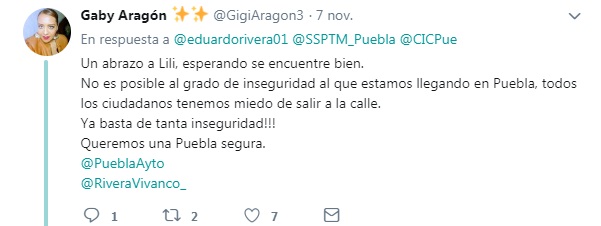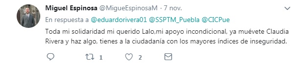 “Mi completa solidaridad @eduardorivera01 Espero que Liliana se encuentre bien. Es lamentable la situación que sufren los poblanos por la incapacidad de @RiveraVivanco_ de afrontar la inseguridad. La inseguridad no es un mito, es una realidad”.