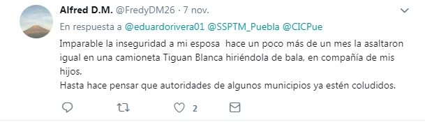 "Hoy hemos vivido la realidad de inseguridad en nuestra Ciudad. Pero también recibimos la solidaridad y aprecio que nos caracteriza a los poblanos. Liliana, nuestros hijos y yo, agradecemos su preocupación; gracias a Dios nos encontramos bien. (…) No fue recuperada. La camioneta fue abandonada y los delincuentes siguen libres. Espero que las autoridades hagan lo propio para que el delito no quede impune y no siga lastimado a más familias", compartió en Twitter.