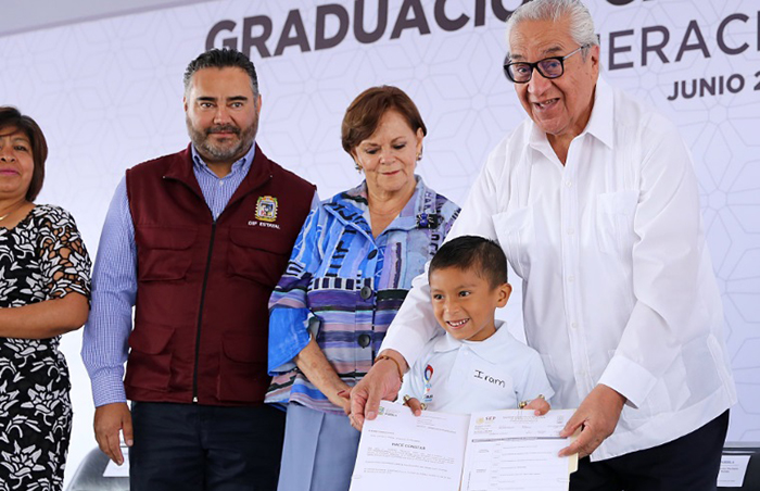 En la explanada del Centro Integral de Servicios (CIS), el mandatario felicitó a los 9 mil 654 alumnos de nivel preescolar graduados de los 327 planteles instalados en 75 municipios del estado.