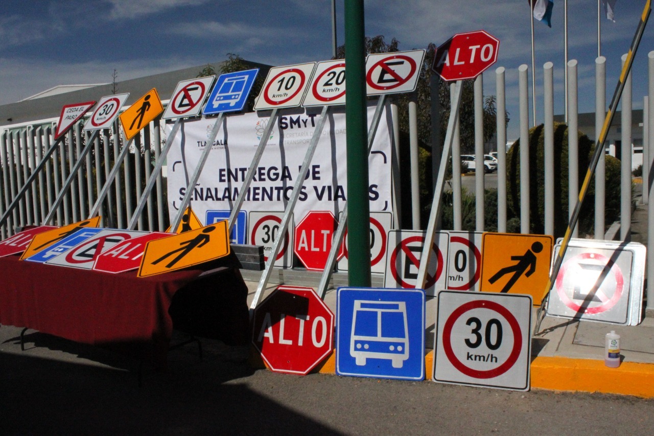 Tlaxcala.- Con una inversión de 437 mil 466 pesos, el gobierno que encabeza Lorena Cuéllar Cisneros entregó un total de 187 señalamientos viales a cuatro municipios y al Fideicomiso de Ciudad Industrial Xicohténcatl (Fidecix), con el objetivo de dotar a la red carretera y caminos de jurisdicción estatal y municipal del material necesario de tipo preventivo, restrictivo, informativo y turístico.
